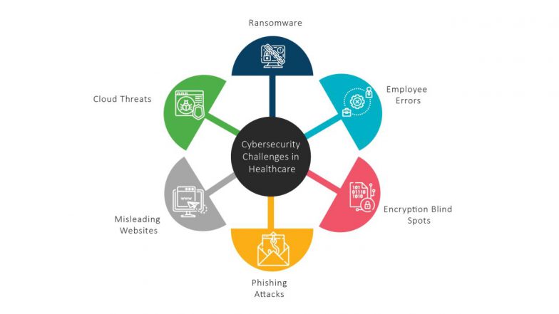 Healthcare cybersecurity challenges include ransomware, data breaches, insecure medical devices and equipment, phishing, insider threats, vulnerable legacy systems, cloud-based threats, supply chain vulnerabilities, DDoS attacks, and lack of cybersecurity awareness and education.