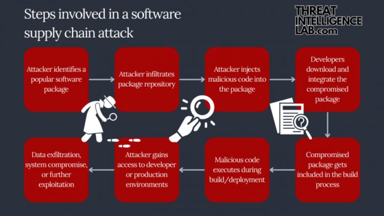 - Reconnaissance: Attackers identify third-party vendors or components (software, hardware, or services) used by the target organization, focusing on those with weaker security.
